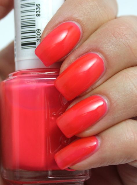 Maahantuojan lahjoittama Essie Camera, melkoinen epeli, sanoisin. Pullossa suloinen, reippaasti pinkkiin taittava korallinsävy, mutta kynsillä vääntyy oranssinpunaiseen. Lakkasin kaksi kerrosta ja kuvittelin lopputuloksen olevan tarpeeksi peittävä, mutta seuraavan päivän tarkastelu näytti toisin. Kynnen kärjet kuulsi jännästi tummana läpi! Mitä ihmettä?!? Niin kuin ne olisi läpinäkyvät.
